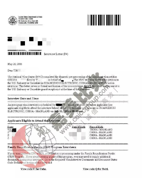 美国EB5投资移民面签通知信: