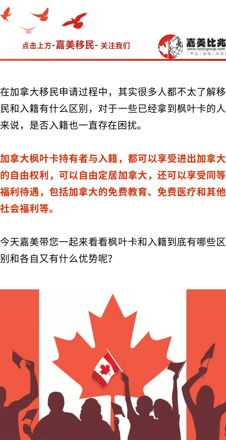 文章摘要:加拿大枫叶卡持有者与入籍,都可以享受进出加拿大的自由权利,可以自由定居加拿大,还可以享受同等福利待遇,包括加拿大的免费教育、免费医疗和其他社会福利等。今天嘉美带您一起来看看枫叶卡和入籍到底有哪些区别和各自又有什么优势呢?