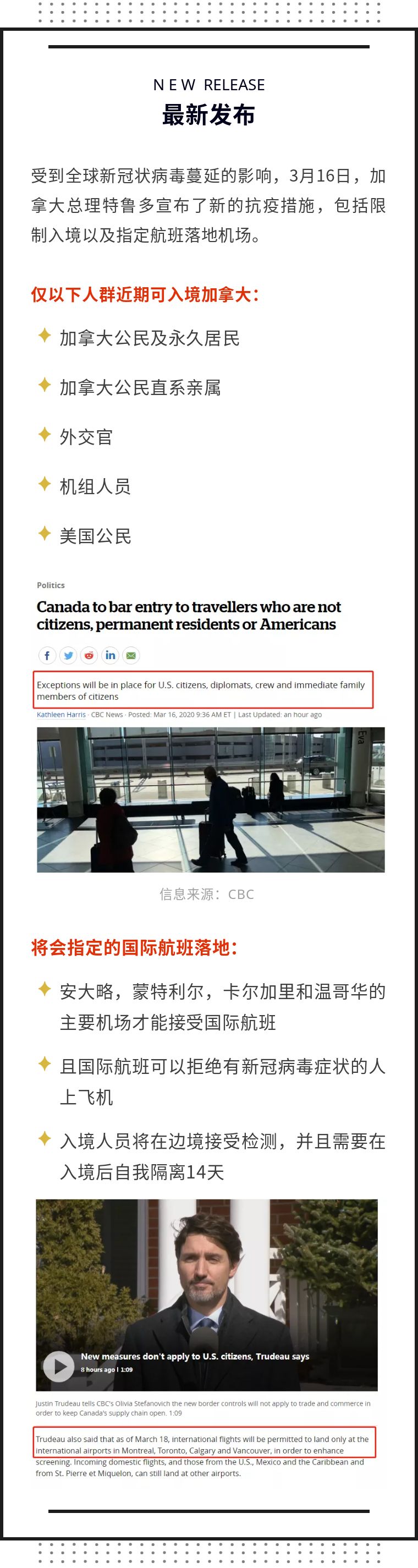 文章摘要:受到全球新冠状病毒蔓延的影响,3月16日,加拿大总理特鲁多宣布了新的抗疫措施,包括限制入境以及指定航班落地机场。