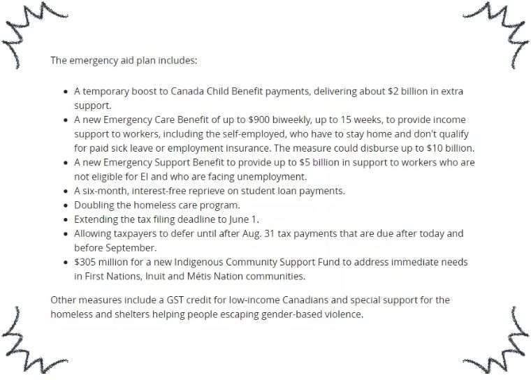 一揽子经济援助包括查看直接将钱交到加拿大人及其家人手中的方法;以及为该国受疫情影响最严重的部门提供的新帮助;以及更广泛的经济刺激措施。