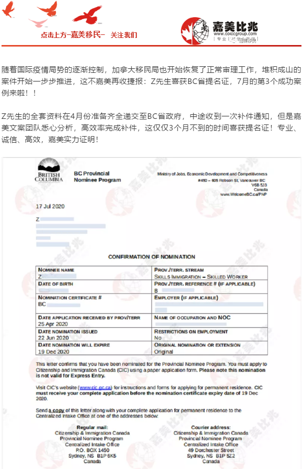 喜讯 | 嘉美Z先生喜获BC省提名!7月的第3个成功案例来啦~