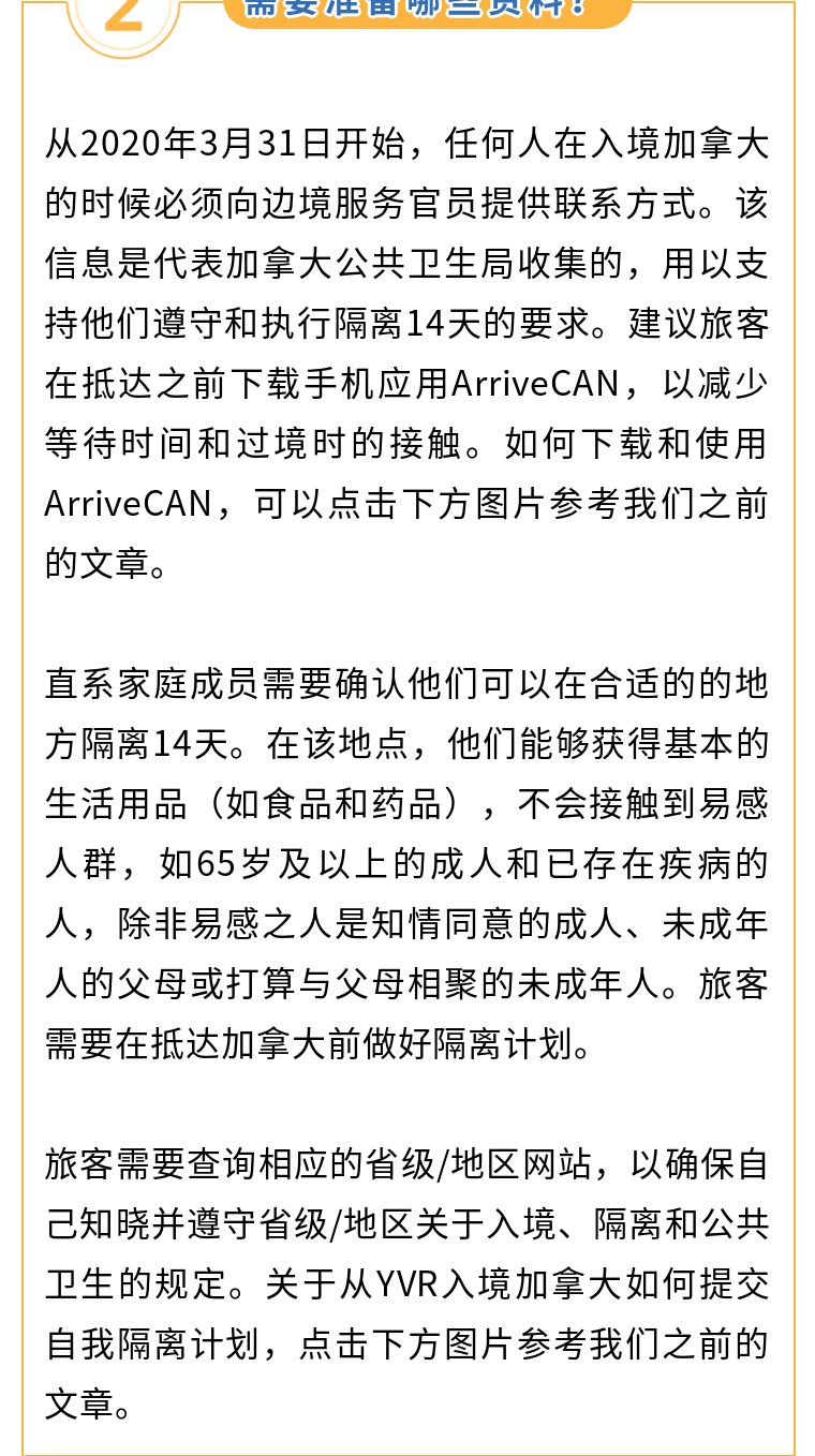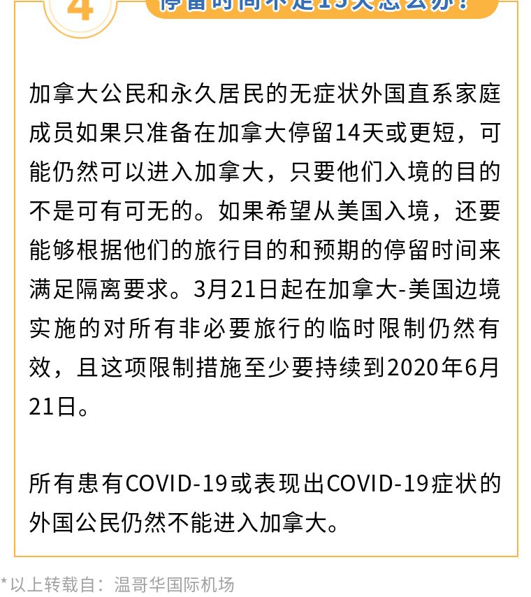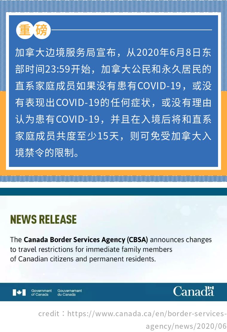文章摘要:加拿大边境服务局宣布,从2020年6月8日东部时间23:59开始,加拿大公民和永久居民的直系家庭成员如果没有患有COVID-19,或没有表现出COVID-19的任何症状,或没有理由认为患有COVID-19,并且在入境后将和直系家庭成员共度至少15天,则可免受加拿大入境禁令的限制。