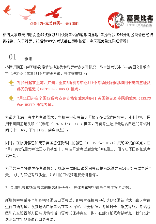 文章摘要:相信大家昨天的朋友圈都被雅思7月恢复考试的消息刷屏啦~考虑到我国部分地区疫情已经得到控制,关于雅思、托福和GRE的考试都在逐步恢复,今天嘉美带您详细看看!
