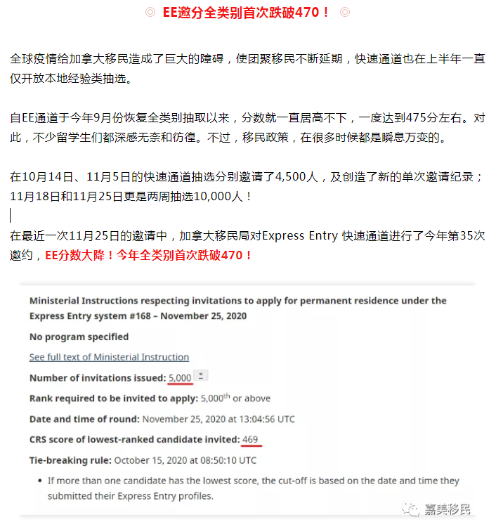 EE邀分全类别首次跌破470!安省雇主担保留学生类别名额开抢!