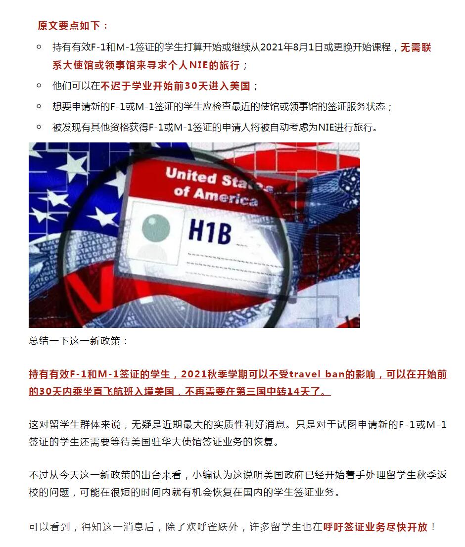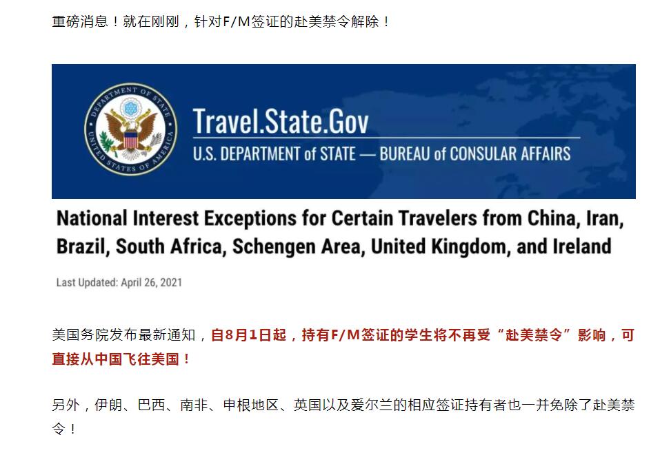 8月1日起,持F-1/M-1签证赴美将不受“14天旅行禁令”影响!